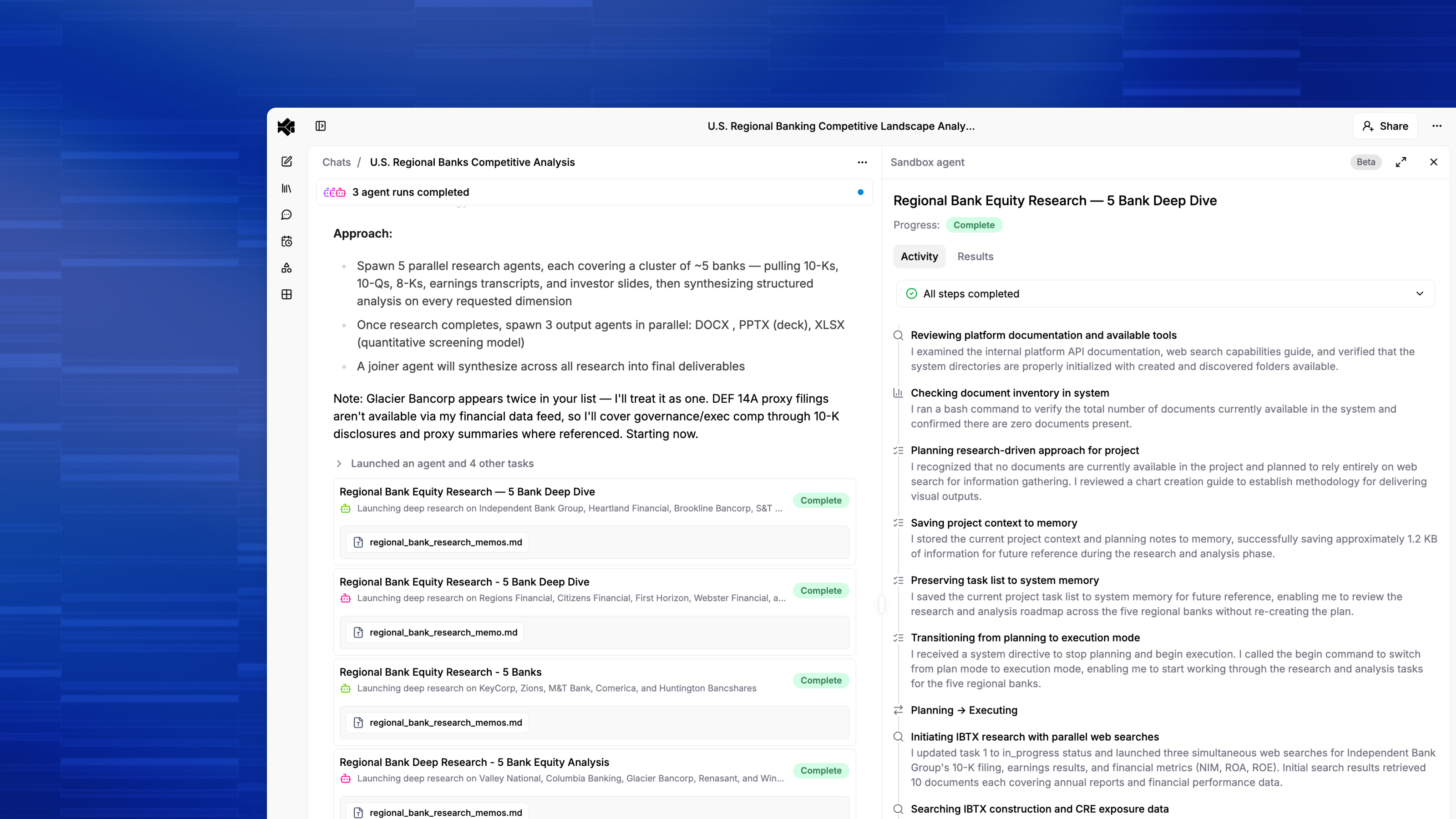 Agents go deeper. With a persistent workspace, agents work through multi-step analyses spanning dozens of documents and multiple iterative passes — work that would take an analyst a full day, compressed into a single workflow. They maintain state across every step. Ask once. The agent remembers what it's working with, what it's already done, and what comes next.
